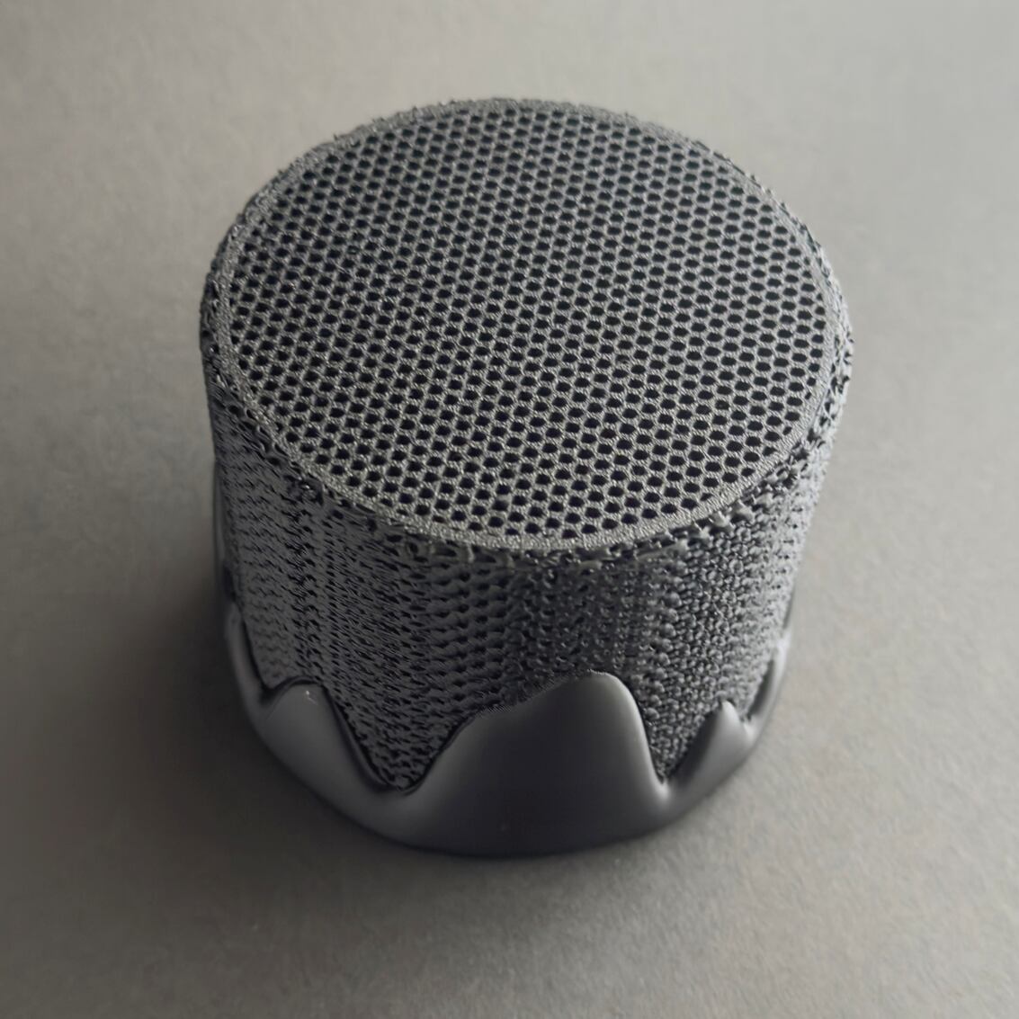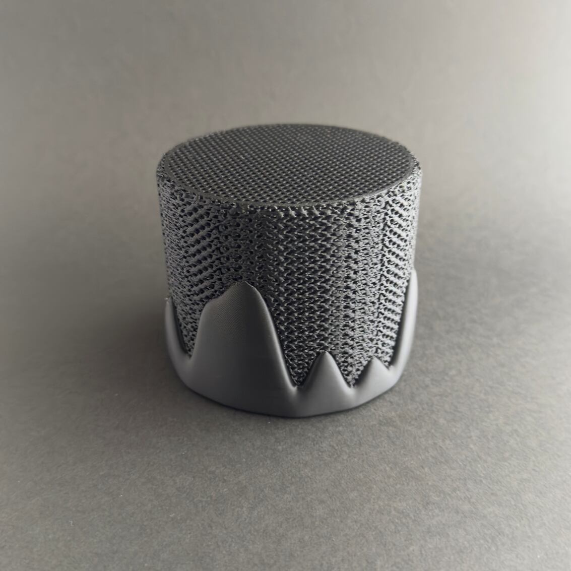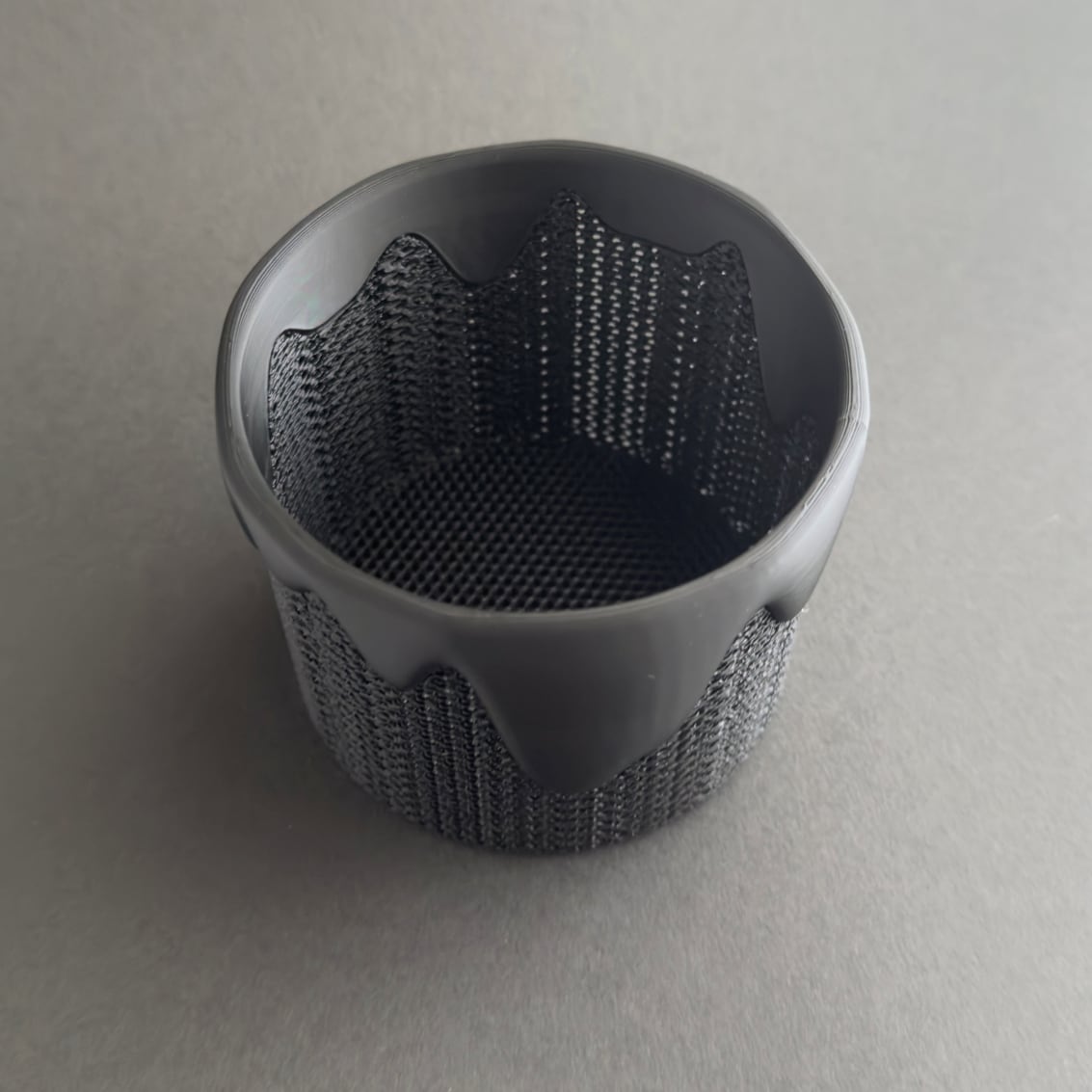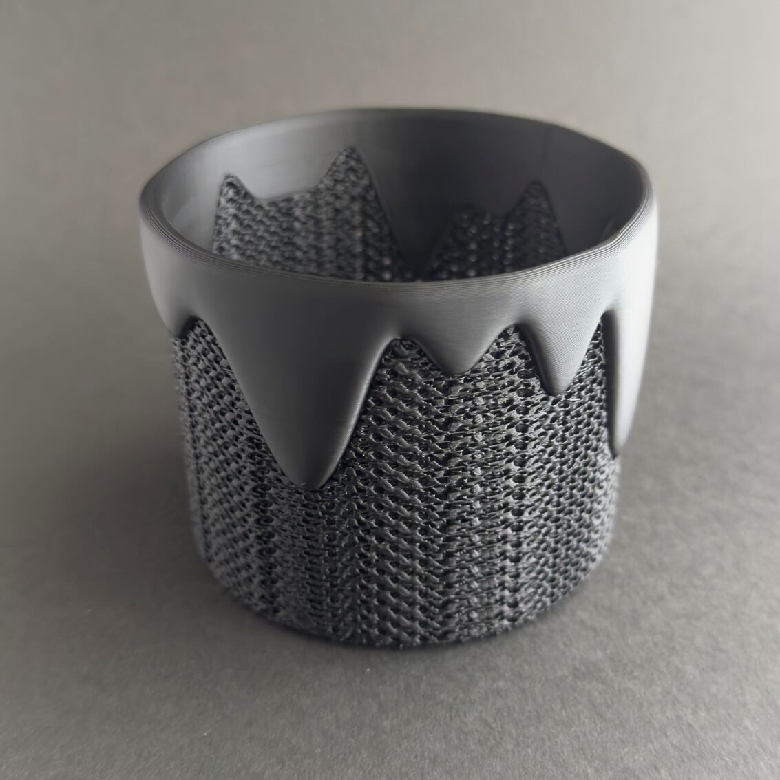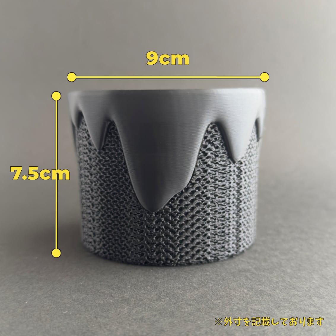 『メルト』は上部の滑らかに垂れるようなフォルムと、下部のジャイロイドメッシュが織りなすコントラストが特徴の3Dプリント植木鉢です。