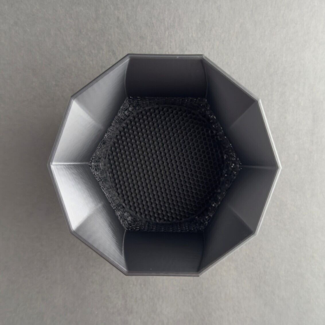 八角形のミニマルで力強いフォルムに、3Dプリンティングによって再現された多孔質構造が融合。